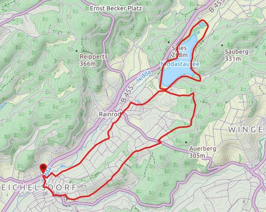 Die Route führt durch das Niddatal von Eichelsdorf nach Rainrod der Weg ist durchgehend asphaltiert und auch bei schlechtem Wetter oder nach Regen gut zu wandern. Sie kommen an einem Fledermaushotel vorbei und können eventuell den Biber in der Nidda bei der Arbeit erleben. Sie passieren die Ortsgrenze von Eichelsdorf nach Rainrod, die Stadtgrenze der Stadt Nidda zur Stadt Schotten, vom Wetteraukreis zum Vogelsbergkreis und vom Regierungspräsidium Darmstadt zum Regierungspräsidium Gießen. Nach dem Ortdurchgang Rainrod erreichen Sie den Niddastausee, den Sie umrunden oder auch nur zu einer Rast nutzen. Zahlreiche Lokalitäten bieten Speisen und Getränke an. Vom Niddastausee gibt es eine Vielzahl von Anschlusstouren durch den Vogelsberg. Empfehlenswert ist ein kurzer Abstecher zu den Mammutbäumen (ca. 1,5 km) Nach dem Niddastausee führt die Tour oberhalb von Rainrod in das Eicheltal. Ein wunderschönes, natürliches Tal mit dem romantischen Eichelbach, der auch schon als Filmkulisse diente. Sie erreichen dann Eichelsdorf mit seinen herrlichen Fachwerkhäusern, überqueren die Nidda am Zusammenfluss mit der Eichel. Nach ca. 15 km haben Sie die Rundtour abgeschlossen und sind wieder am Startpunkt an der Bushaltestelle Eichelsdorf-Mitte.